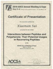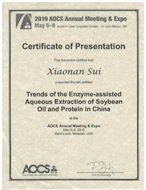 本次会议上,买球赛的app官网隋晓楠教授与爱荷华州立大学BuddhiLamsal教授共同主持Biotransformationof Proteins会场,并做会场报告“InteractionsbetweenPeptides and Polyphenols: Their Potential Usages in RecoveringPeptides”。同时,隋晓楠教授受邀在Processingof Oils and Fats in China and the US会场做“Trends ofthe Enzyme-assisted Aqueous Extraction of Soybean Oil andProtein in China”口头报告。