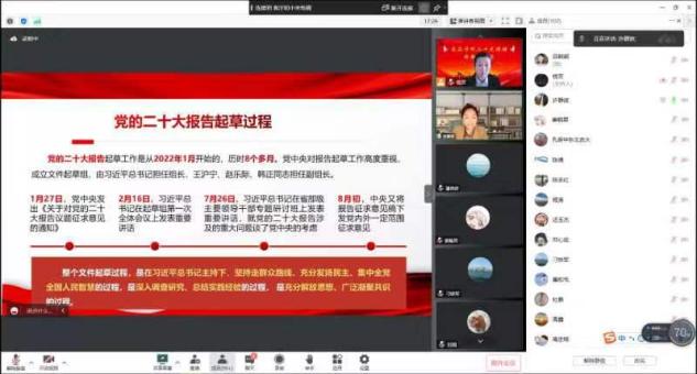 11月30日下午,食品学院党委召开了学习贯彻党的二十大精神宣讲会。马克思主义学院院长许静波教授受邀以“团结奋进,开创全面建成社会主义现代化强国新篇章”为题为学院全体教师做了一场精彩的学习党的二十大精神专题宣讲报告。食品学院副院长刁铁军带领住校教师在食为天315集中收看了宣讲会,学院全体教职员工以线上形式积极参与。宣讲会由食品学院党委副书记钱芳主持。