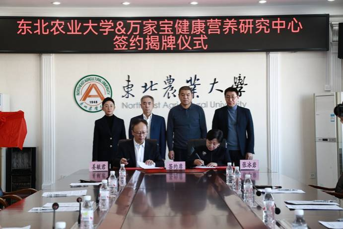 孙占峰、柴宝全分别代表学校及万家宝鲜牛奶集团共同为“东北农业大学&万家宝健康营养研究中心”揭牌。
