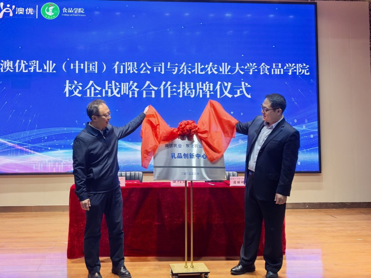 姜毓君、李威共同为“澳优乳业东北农业大学乳品创新中心”揭牌。