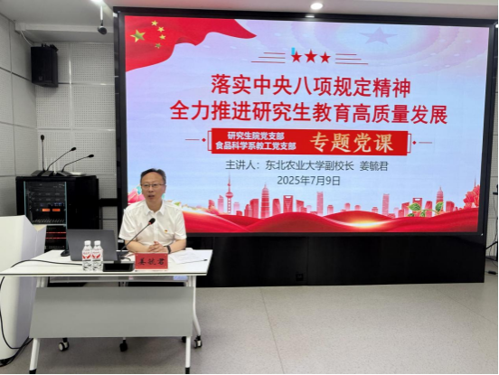 为深入贯彻中央八项规定精神,持续深化作风建设,筑牢党员干部思想根基,7月9日上午,东北农业大学副校长姜毓君以《落实中央八项规定精神,全力推进研究生教育高质量发展》为题讲授专题党课,研究生院、我院食品科学系教工党支部全体党员参加学习。