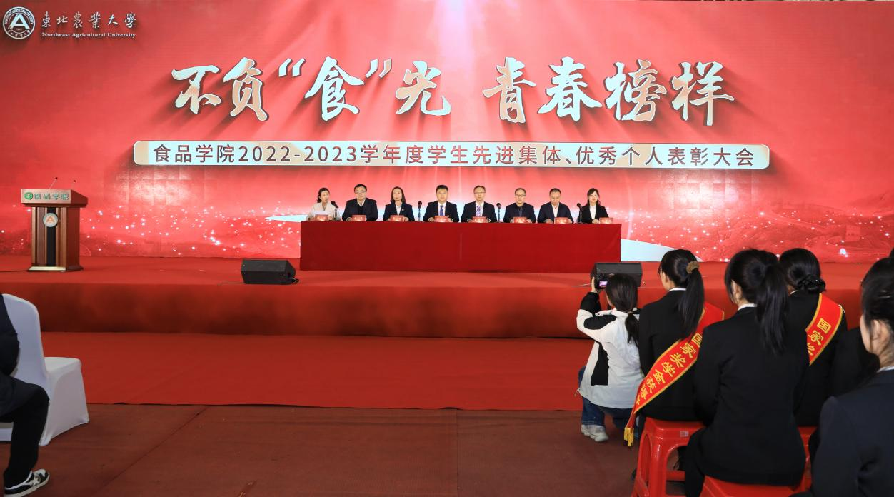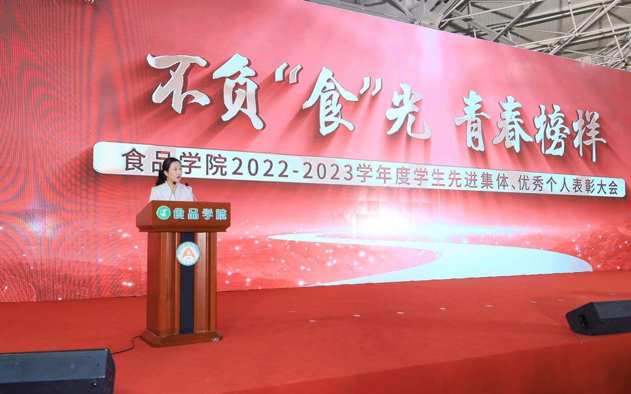 3月22日晚,“不负‘食’光,青春榜样”食品学院2022-2023学年度学生先进集体、优秀个人表彰大会在体育馆隆重举行。校学生工作部部长于兴业,我院院长姜毓君,正处级辅导员崔丽,副院长刁铁军、李良,副处级辅导员金靖博、张鑫琳,学院全体辅导员和1600余名学生参加了会议。大会由我院党委副书记钱芳主持。