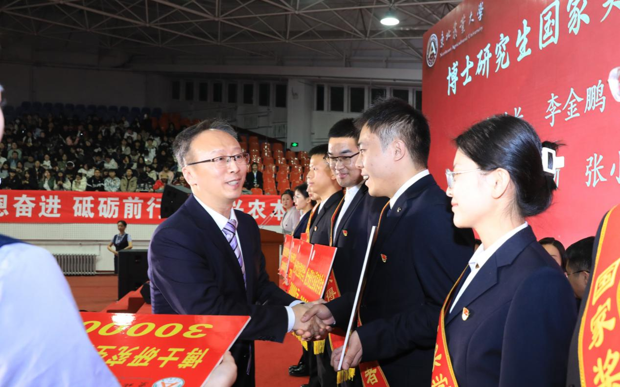 2021级粮食油脂及植物蛋白工程专业博士研究生闫世长代表研究生国家奖学金获得者发言,“感谢龙江大地肥沃黑土给予营养,感谢东农培养给予力量,龙江振兴、东农发展需要学子反哺,希望学弟学妹们坚定理想信念,将”小我”融入”大我”,以扎扎实实的行动奔赴光荣与梦想的远征,在青春的赛道上奋力奔跑”。