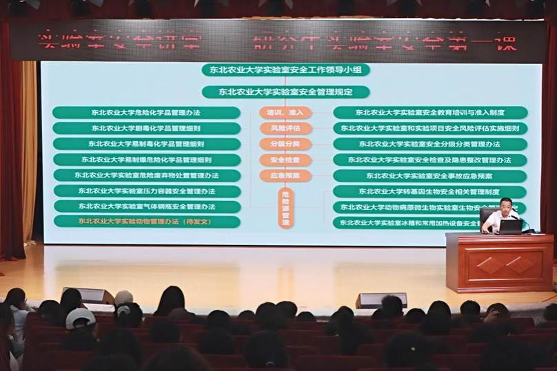 为进一步深化平安校园建设,增强师生实验室安全意识和事故防范处置能力,有效预防实验室安全事故发生,9月18日中午,我院在图书馆一楼报告厅举办2025级研究生实验室安全教育专题讲座。会议由我院副院长徐宁主持。实验室管理处副处长张艳国、校实验室安全培训讲师团成员石佳卉、曹莹作培训。我院2025级全体研究生参加本次讲座。