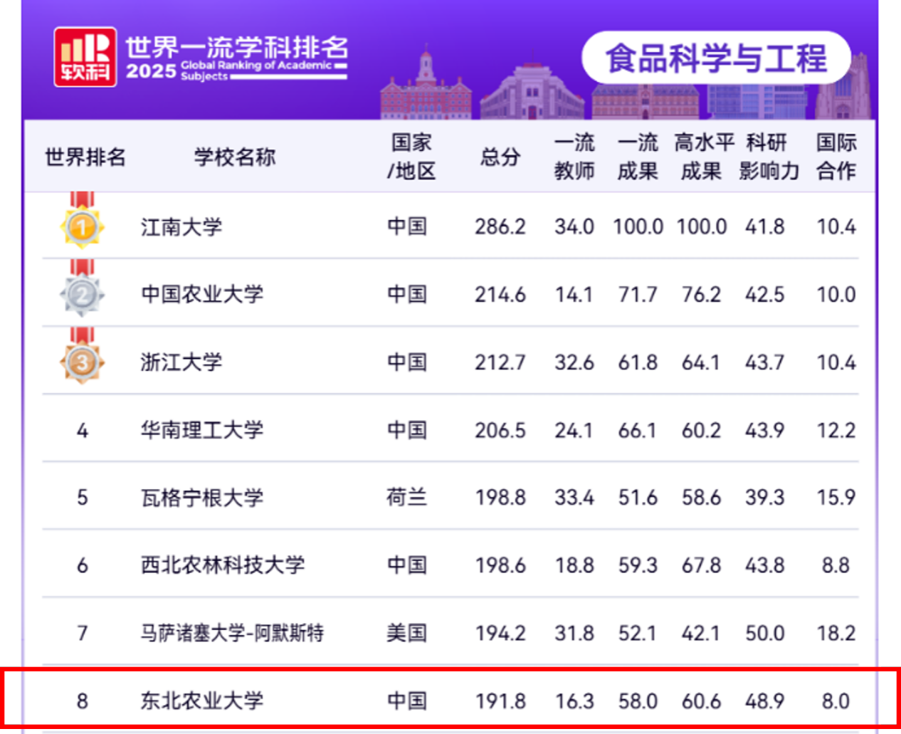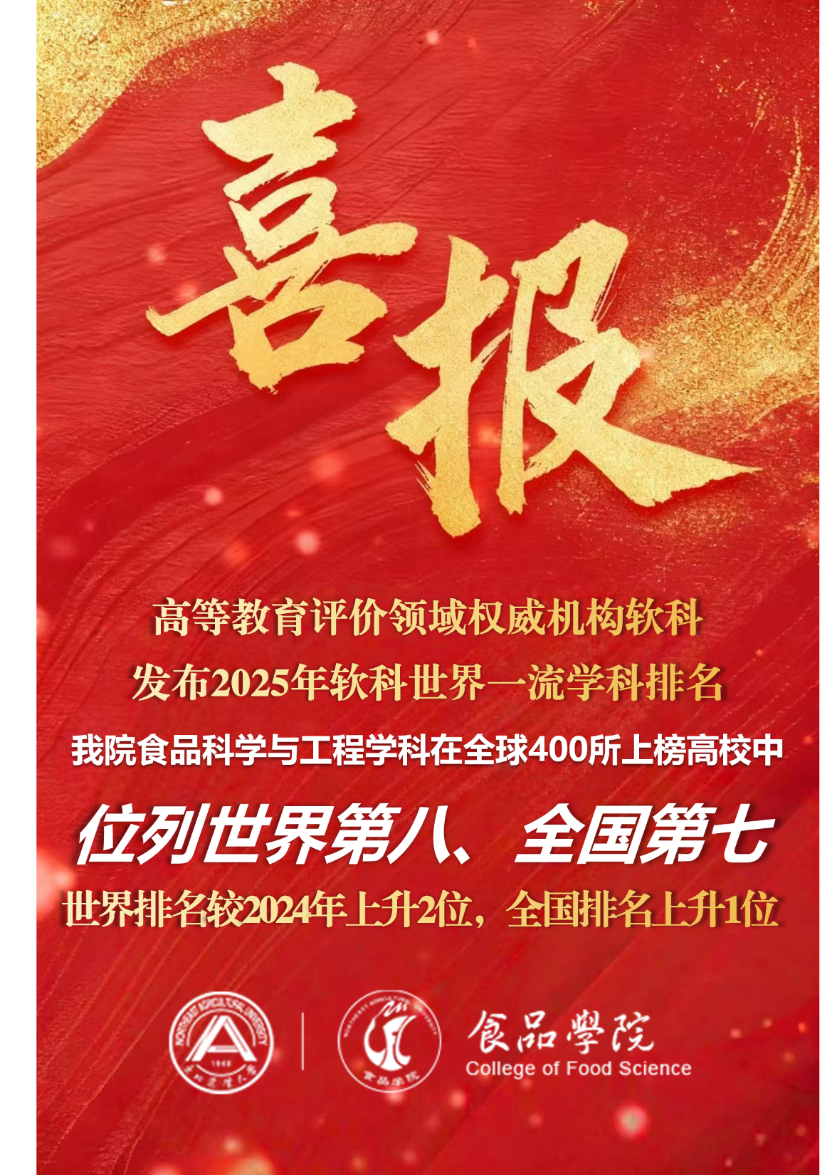 近日,高等教育评价领域权威机构软科发布2025年软科世界一流学科排名(ShanghaiRanking's Global Ranking of Academic Subjects,简称GRAS)。我院食品科学与工程学科表现亮眼,在全球400所上榜高校中位列第八,同时位居全国第七,世界排名较2024年上升了2位,全国排名上升1位,标志着我院食品科学与工程学科在国际学术竞争力与综合影响力上呈现出显著优势。