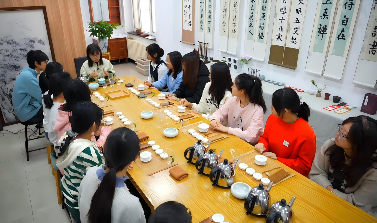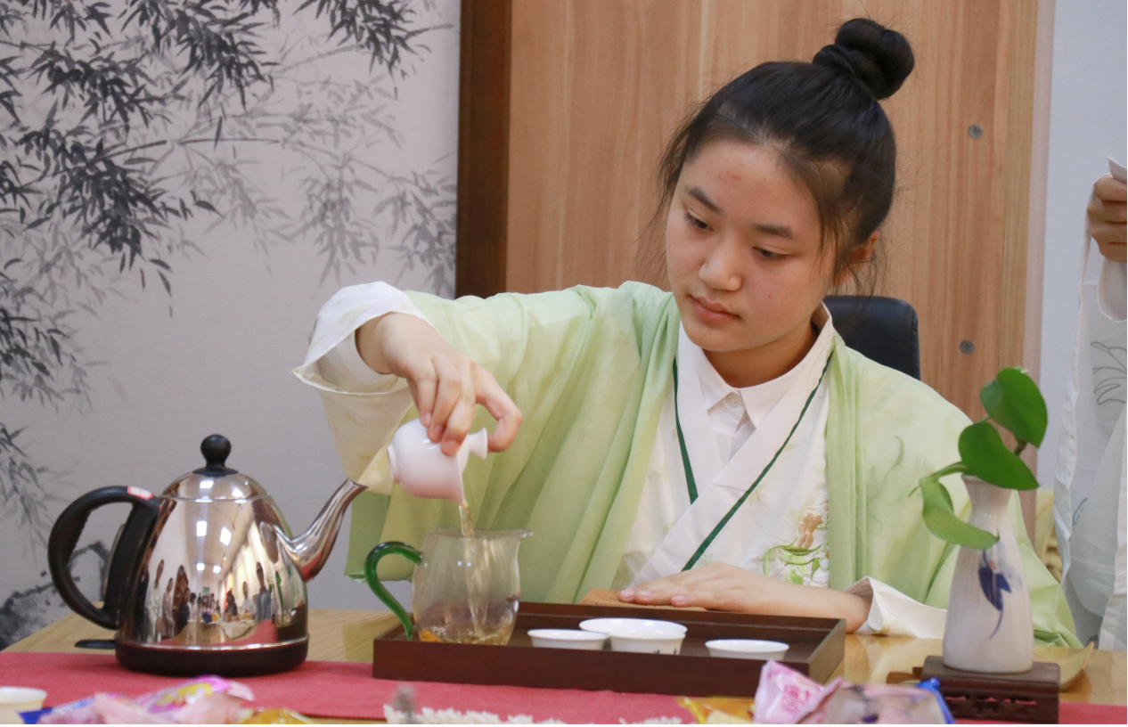 课程汇报以小组茶艺展示形式展开。学生身着汉服,演示温具、置茶、冲泡、奉茶的完整流程,动作娴熟优雅,讲解流畅自信,充分展现了课程学习的扎实成效与身心共融的成长风貌。