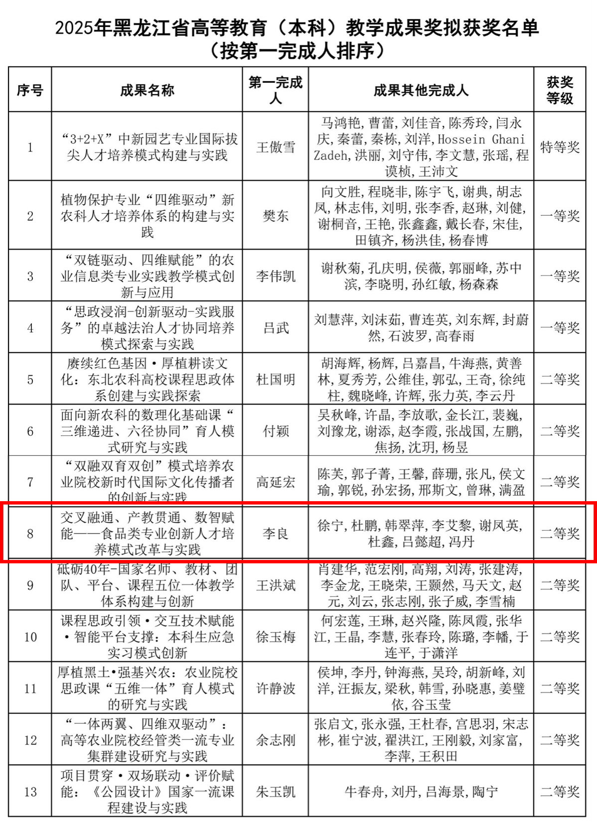 近日,黑龙江省教育厅公布了2025年黑龙江省高等教育(本科)教学成果奖获奖名单。我院1项教学成果“交叉融通、产教贯通、数智赋能——食品类专业创新人才培养模式改革与实践”获得省高等教育(本科)教学成果奖二等奖。