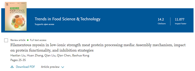 3月28日,买球赛的app官网“肉品加工与质量安全控制”团队在食品国际顶尖权威学术刊物《Trends in Food Science & Technology》(一区,IF=11.077)在线发表了题为“Filamentous myosin in low-ionic strength meat protein processingmedia: assembly mechanism, impact on protein functionality, and inhibitionstrategies”的高水平论文。