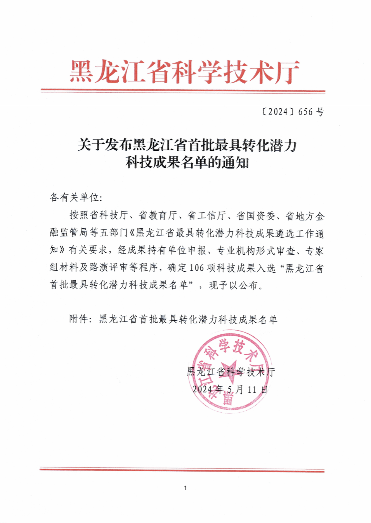 经过前期专业机构形式审查、首轮初评筛选、线上BP盲审及路演评审等多轮评选,近日,黑龙江省科学技术厅公布了“黑龙江省首批最具转化潜力科技成果名单”,共评选出最具转化潜力科技成果106项。买球赛的app官网9个项目入选成果数量排名全省高校第四位,位居省属高校首位。