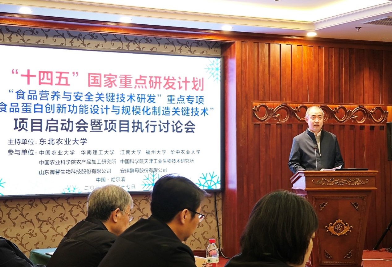 王宁代表省科技厅对项目的立项启动表示祝贺。他表示,本项目是落实习近平总书记关于树立大食物观重要论述的具体行动。黑龙江省作为农业大省,拥有丰富的自然资源和坚实的产业基础,是国家粮食安全的压舱石。近年来,省委、省政府高度重视农产品加工产业发展,先后出台黑龙江省加快推进农产品加工业高质量发展三年行动计划和黑龙江省支持农产品精深加工业高质量发展政策措施等文件,为推动农产品加工领域的科技创新与产业创新深度融合提供了有效保障。作为项目的推荐单位,省科技厅将深入贯彻落实省委、省政府工作部署,全力支持国家重点研发计划项目的有序实施,为推动食品加工产业发展贡献科技力量。希望项目组严格按照项目管理要求,精心组织,科学规划,团结协助,确保项目顺利推进,为推动蛋白食品产业可持续发展作出应有的贡献。