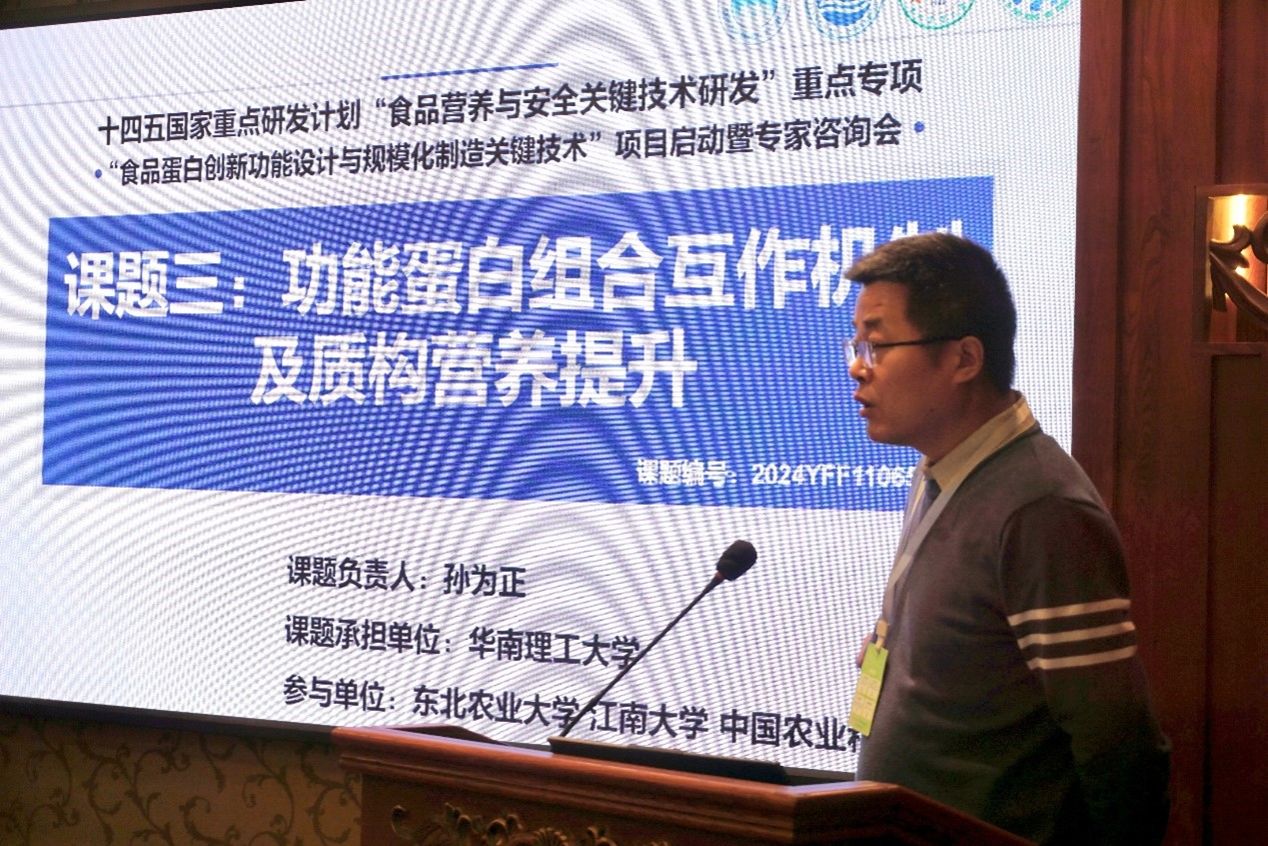 孙世钧对莅临的领导、专家和项目组成员表示热烈欢迎,对大家长期以来对学校的关心和支持表示感谢,并介绍了学校“十四五”以来获批国家重点研发计划及重大专项项目情况。他指出,国民营养与健康状况是反映一个国家经济与社会发展水平的重要指标。通过该项目的实施,为我国食品蛋白领域的发展提供有力的科技支撑,推动了我国食品产业向高质量、高附加值方向发展,助力健康中国建设。他表示,作为项目牵头单位,买球赛的app官网将加强项目的日常管理与服务,为项目顺利实施提供坚实的条件保障,不辜负管理部门与合作单位的期望和信任。在下一步的执行过程中,希望项目团队及各课题组能够充分发挥各自优势,以高度负责的态度和高效协同的精神,确保项目高质量、高标准完成,早日实现成果产业化,让科技发展红利最大程度惠及社会公众,为我国国民营养保障事业的发展作出新的更大贡献。