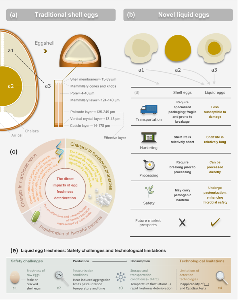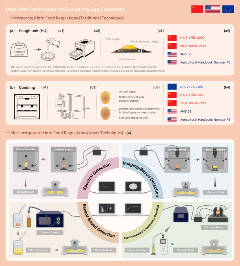 随着全球液态蛋消费的快速增长,基于壳蛋的传统新鲜度评价体系已难以满足蛋品工业的发展与市场监管的需求。该综述系统梳理了鲜蛋新鲜度劣变的系统机制及国内外检测技术的研究进展,分析了传统HU模型与灯检技术的局限性,并阐明了光谱检测、成像检测、嗅觉传感与电化学计量学检测等新兴技术在实现快速、无损、在线和自动化检测方面的重大潜力。结论表明,壳蛋与液蛋在贮藏中经历蛋白质变性、水分迁移与理化性质变化等复杂交互过程,而传统检测方法难以满足液蛋产业化的检测需求。新兴光谱与成像技术具备高灵敏、非破坏和高通量等优势,结合机器学习和集成学习模型,有望实现鲜蛋新鲜度的快速、无损、智能识别与在线监测。综述系统阐述壳蛋与液蛋在贮藏过程中的新鲜度劣变机制,比较并分析传统与新型检测技术的原理、性能与适用范围,分析并强调光谱、成像、嗅觉与电化学检测在蛋品分析中的应用进展与发展潜力,提出液蛋新鲜度检测的关键技术瓶颈与未来发展方向。该工作为建立液蛋国际安全标准和推动鲜蛋安全检测智能化提供了理论支撑与技术参考。