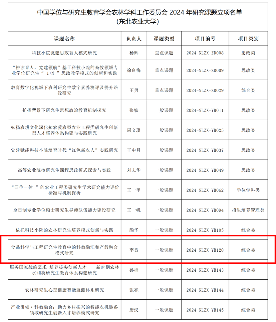 近日,中国学位与研究生教育学会农林学科工作委员会发布了2024年研究课题立项名单。全国共有188项课题获准立项,其中重点课题31项,一般课题157项。买球赛的app官网共申报研究课题22项,获准立项14项,其中重点课题3项(思政类2项、综合类1项),一般课题11项(思政类4项、学位学科类1项、招生培养管理类1项、综合类5项),获批立项总数取得重大突破,创历史新高,并位居全国农林高校前列,我院李良老师的“食品科学与工程研究生教育中的科教融汇和产教融合模式研究”项目成功立项。