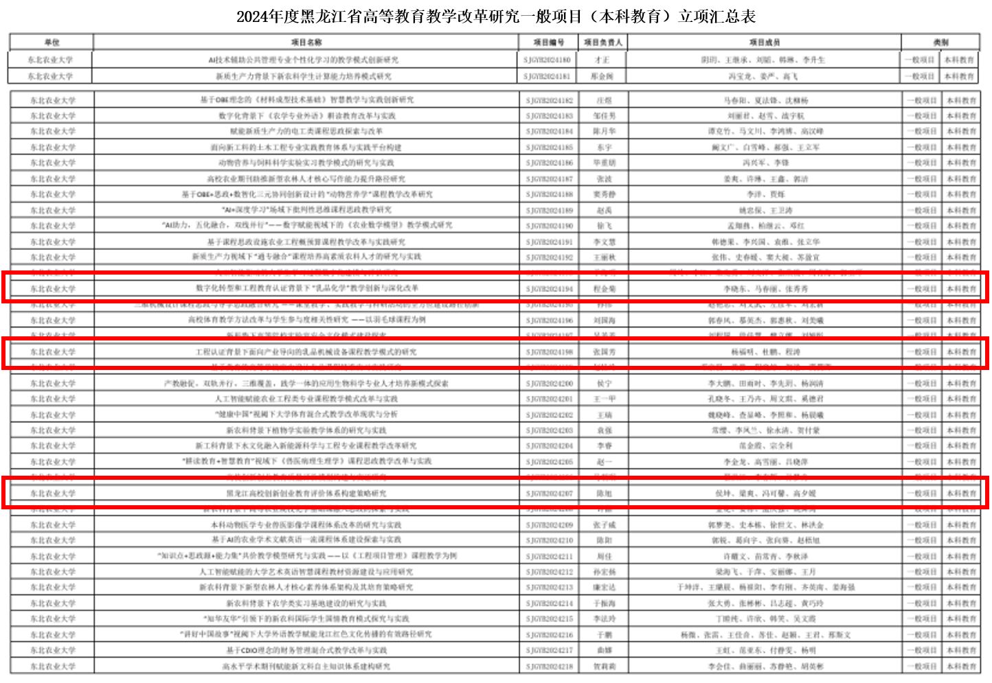 近日,黑龙江省教育厅印发《关于公布2024年度黑龙江省高等教育教学改革研究项目立项名单的通知》(黑教研函[2025]24号)。我院获批立项4项,其中刘骞主持的“红色文化资源融入食品科学与工程类人才培养体系探索与实践”获批重点项目。程金菊主持的“数字化转型和工程教育认证背景下‘乳品化学’教学创新与深化改革”、张国芳主持的“工程认证背景下面向产业导向的乳品机械设备教学模式的研究”、陈旭主持的“黑龙江高校创新创业教育评价体系构建策略研究”获批一般项目。